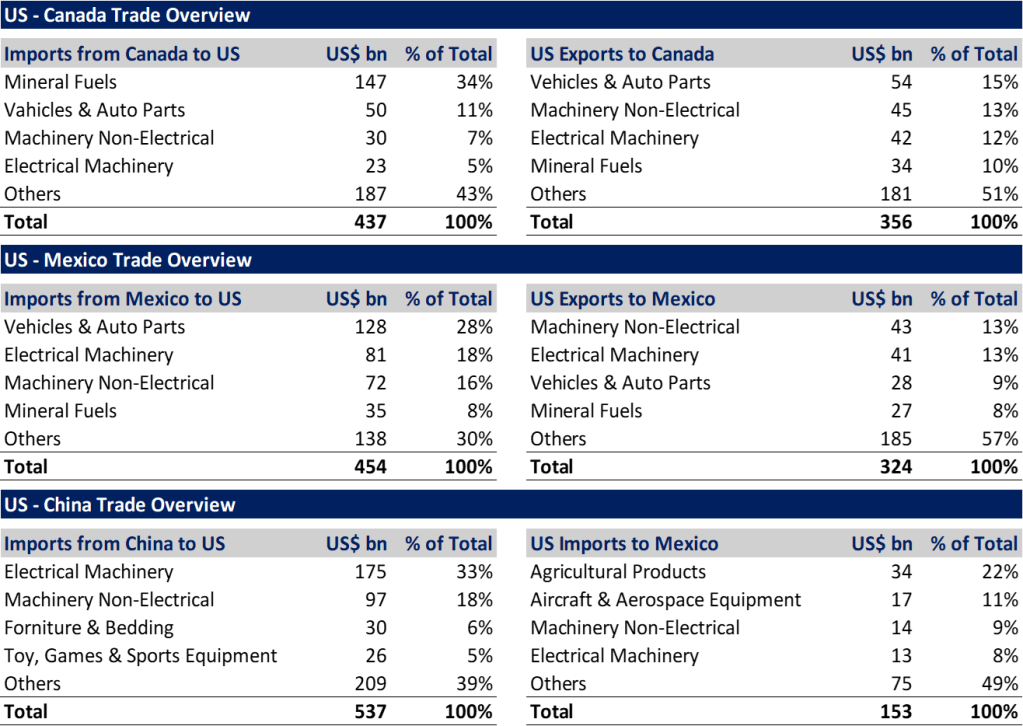 En los cuadros adjuntos se muestran las principales exportaciones e importaciones entre US. y Canadá, México y China. Estos reflejan la magnitud y complejidad de las relaciones comerciales entre las naciones.