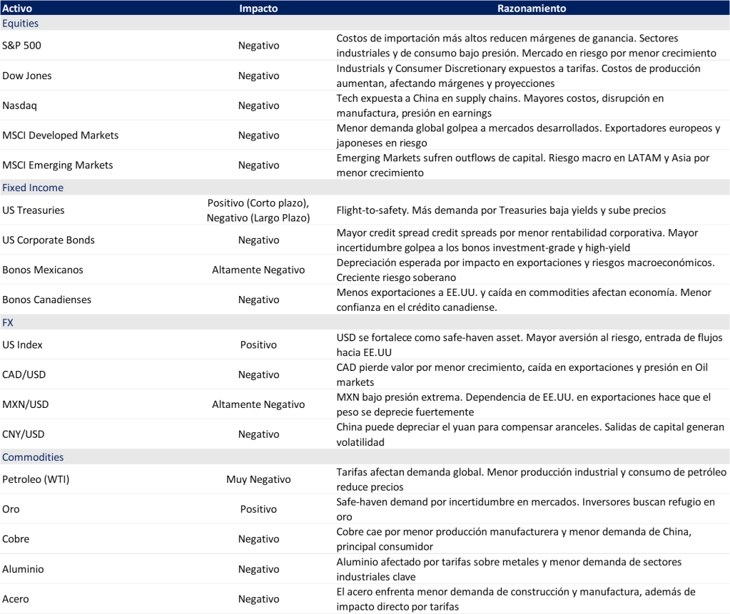 En el siguiente cuadro se presenta un análisis del impacto esperado en equities, fixed income, FX y commodities, junto con el razonamiento detrás de cada efecto: